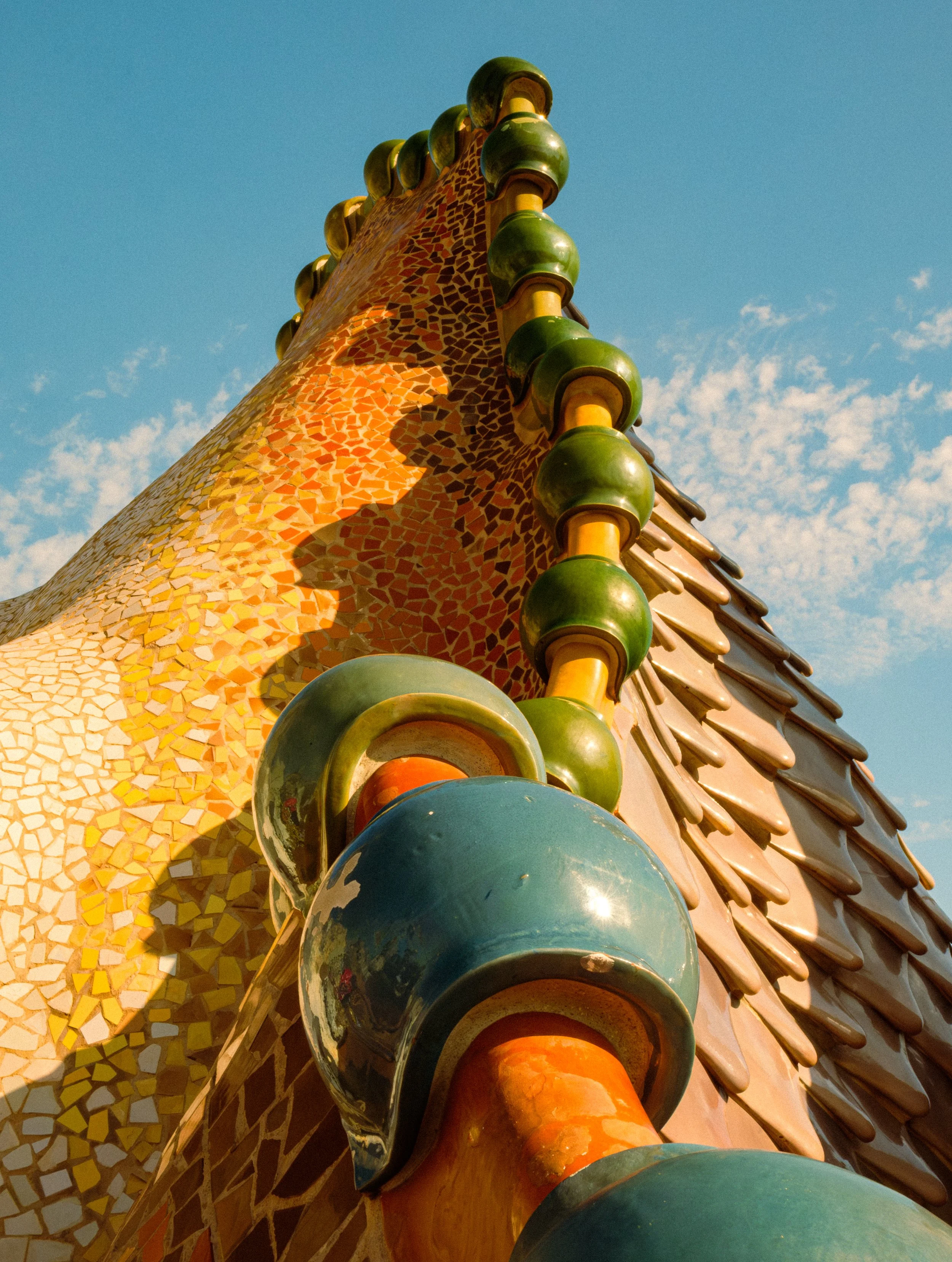 Close-up view of colorful, decorative ceramic tiles and rounded green ornaments on the corner of a building with a clear blue sky in the background.