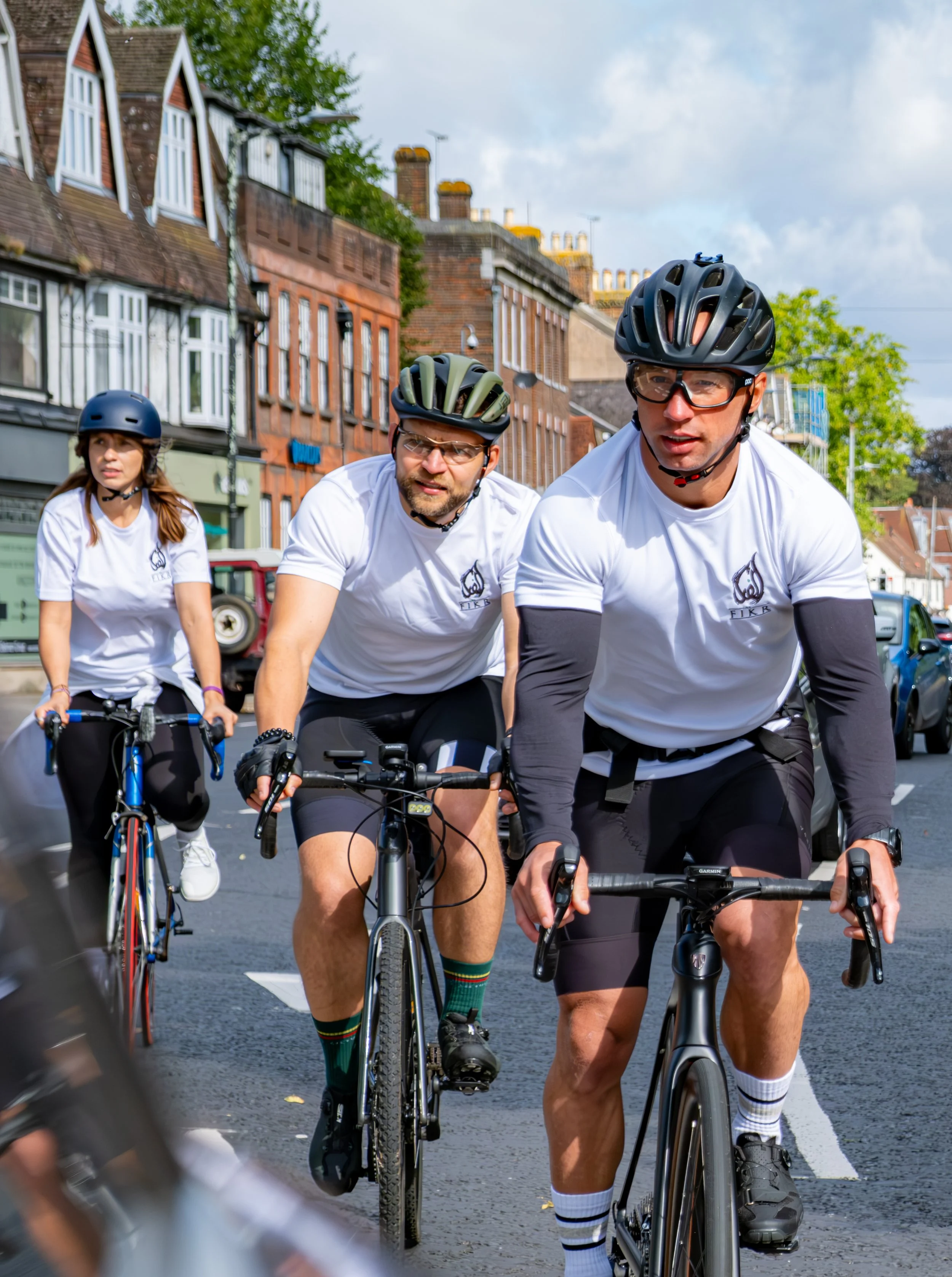 Three cyclists riding on a city street, wearing helmets and white t-shirts, with houses and trees in the background.
