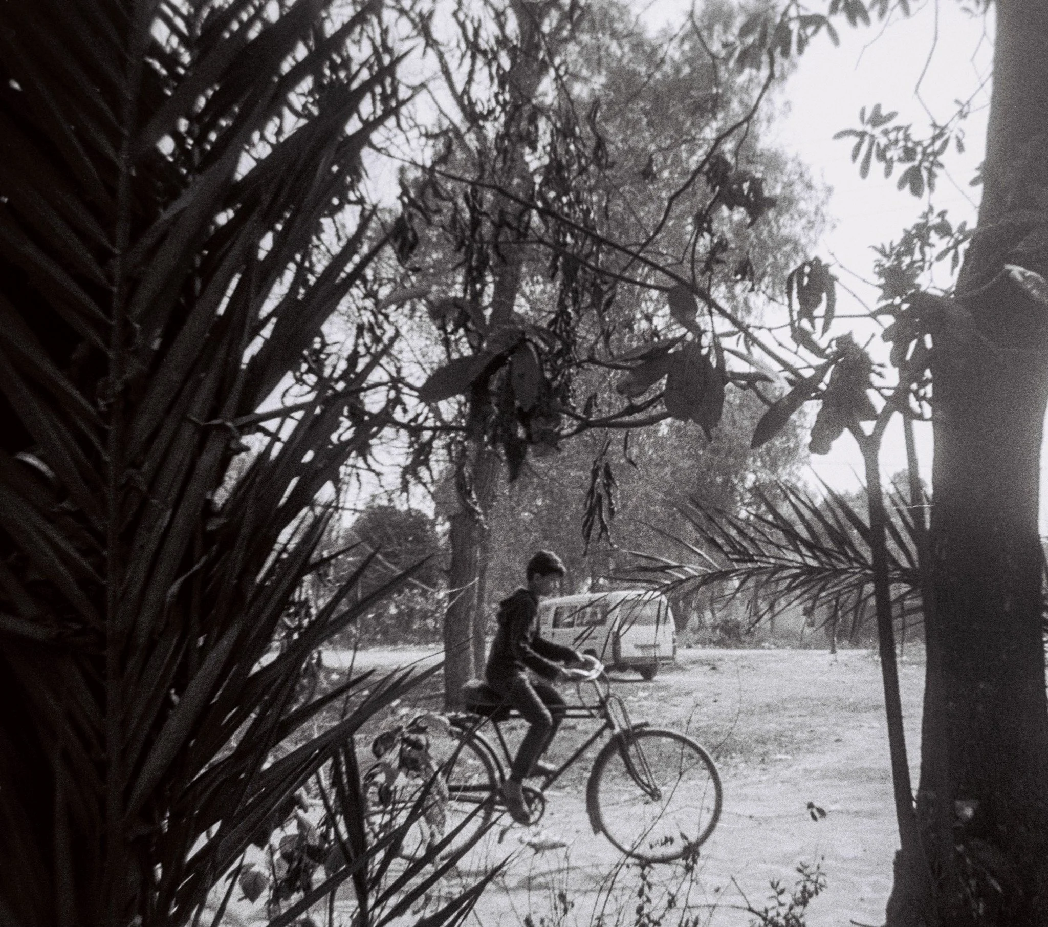 A boy riding a bicycle on a dirt path in a park, surrounded by trees and foliage, with a van in the distance.